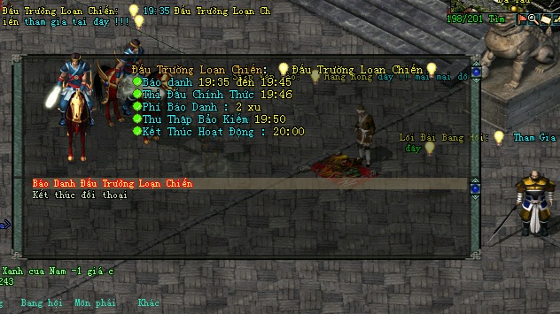 | Bước 2 | Giai đoạn chiến đấu từ 19h45 – 20h00 : Trong 15 phút này quý nhân sĩ sẽ nhận trạng thái “Che tên nhân vật” – “Loạn Chiến” – “Auto PK không có tác dụng” , sau 15 phút chiến đấu nếu không tìm ra được người chiến thắng tính năng sẽ kết thúc |
